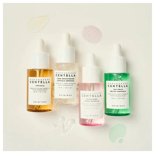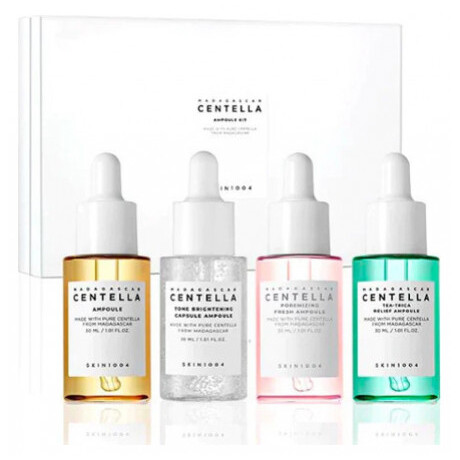 Το κιτ αμπούλας Centella Madagascar περιέχει: Αμπούλα Madagascar Centella 30ml, Madagascar Centella Tone Brightening Capsule Ampoule 30ml, Madagascar Centella Poremizing Fresh Ampoule 30ml, Madagascar Centella Tea-Trica Relief Ampoule 30ml